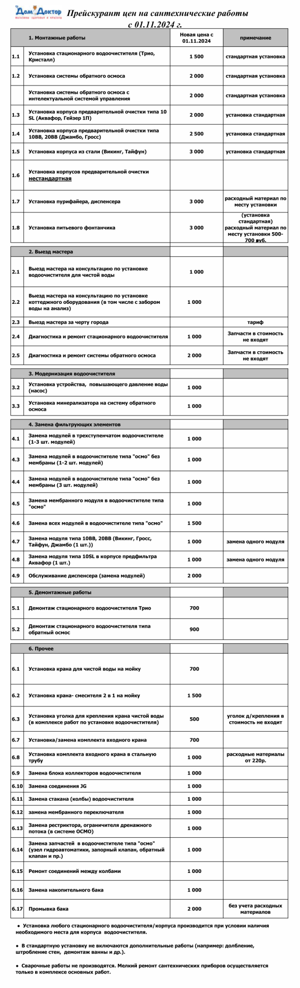 1. Установка стационарного водоочистителя (Трио, Кристалл) - 1 500 руб.